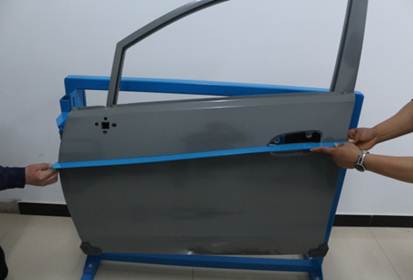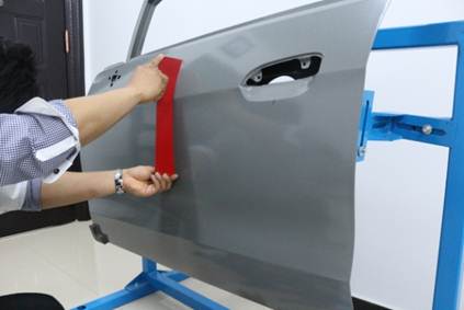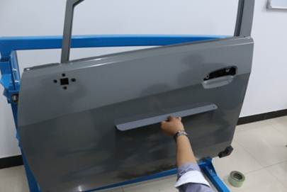 在40分鐘內(nèi),對雪佛蘭新賽歐左前門外板上的長80mm,寬40mm,深10mm的條形凹陷(漆膜已破壞)進行修復,凹陷損傷穿過車身線。